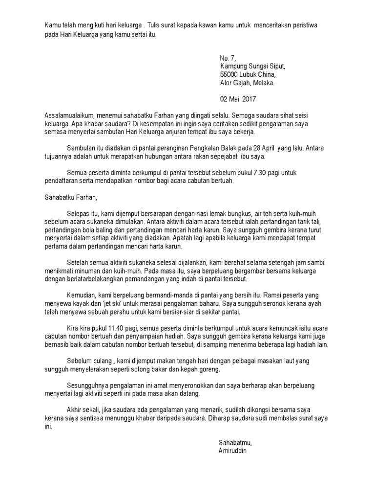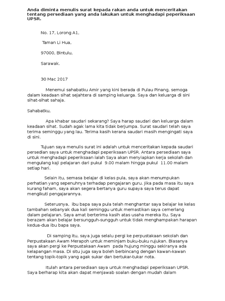 Contoh Karangan Surat Tidak Rasmi Upsr 2017